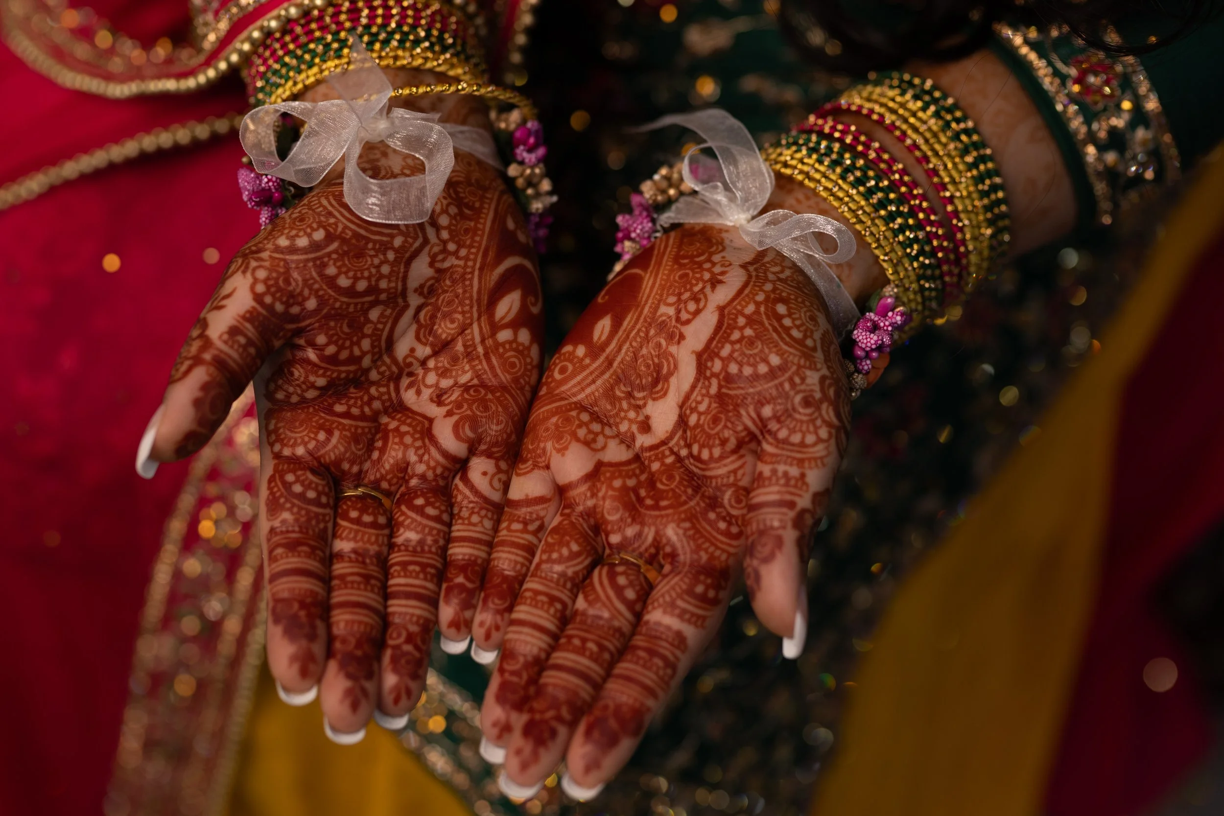 • Close-up of hands and arms decorated with henna designs, jewelry, and traditional attire, likely for a special occasion like a wedding.