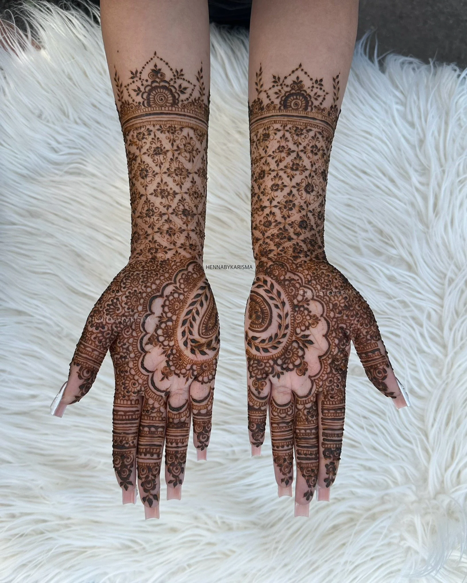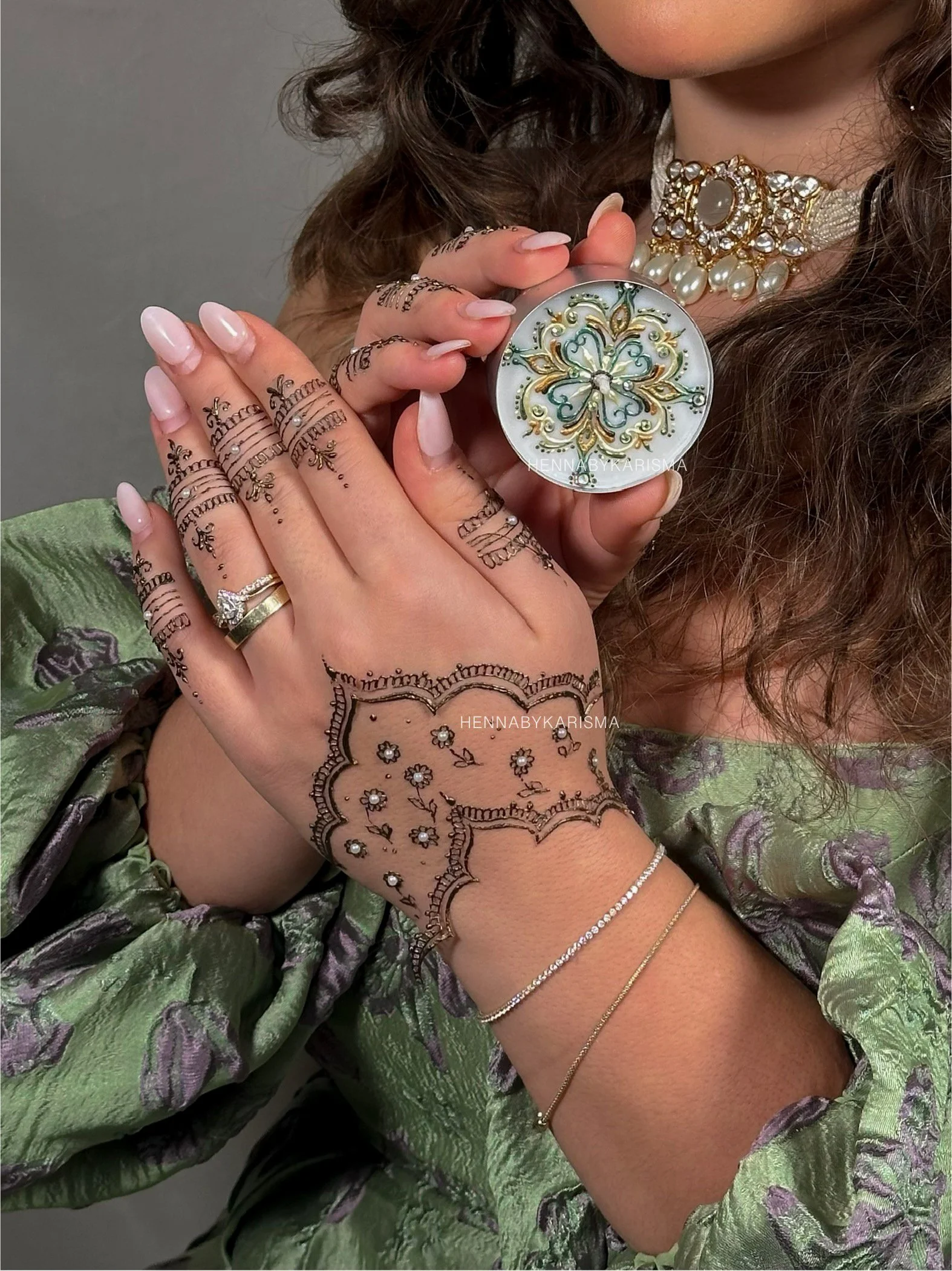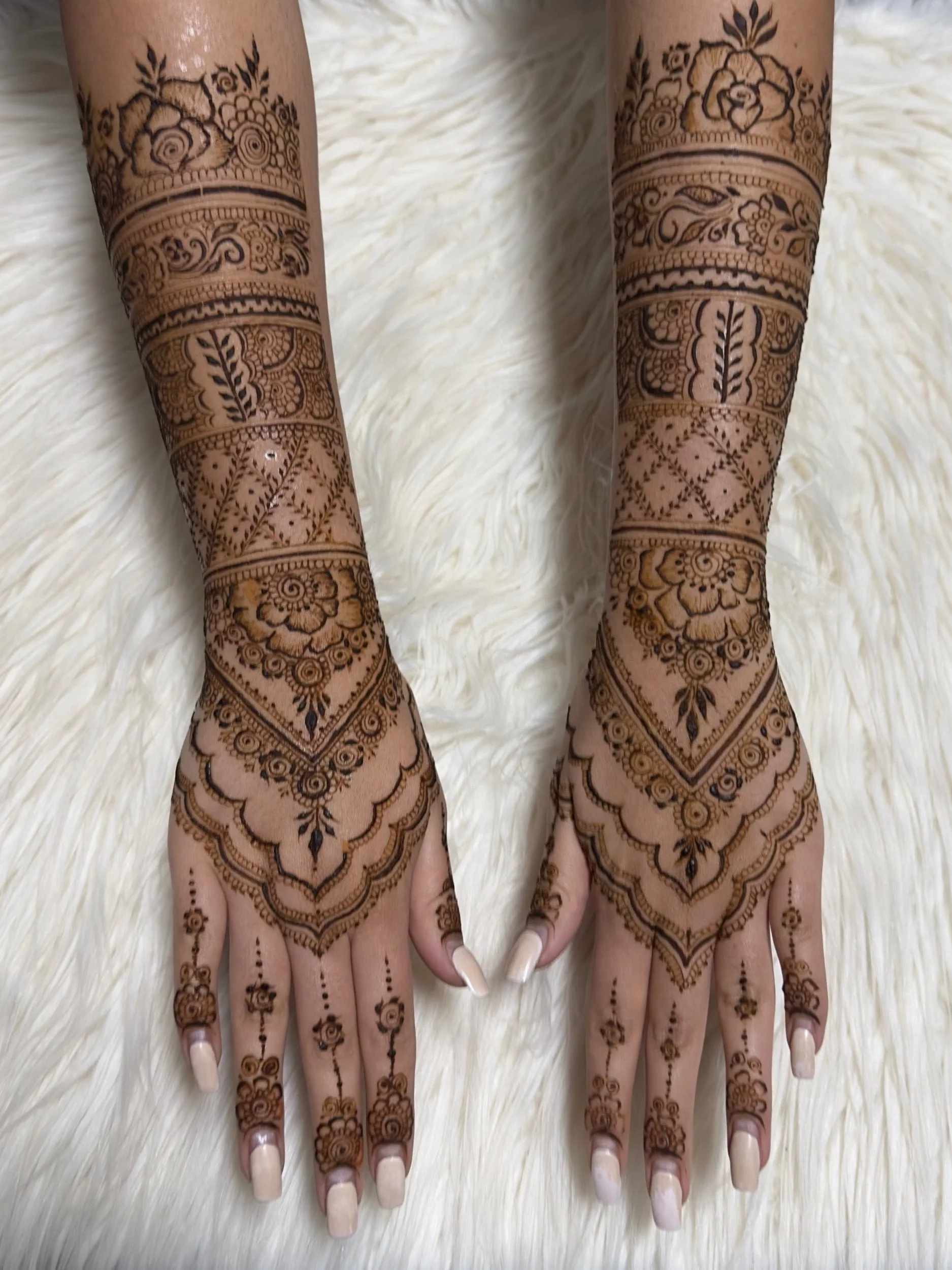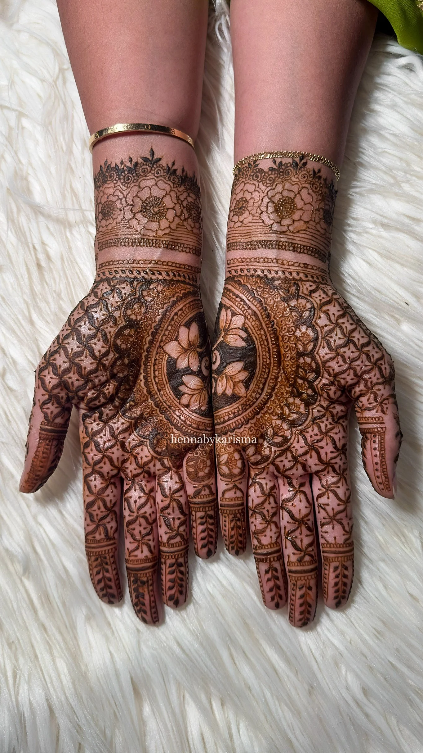 Full bridal henna can take 8–12 hours to complete; patience is appreciated throughout the process.